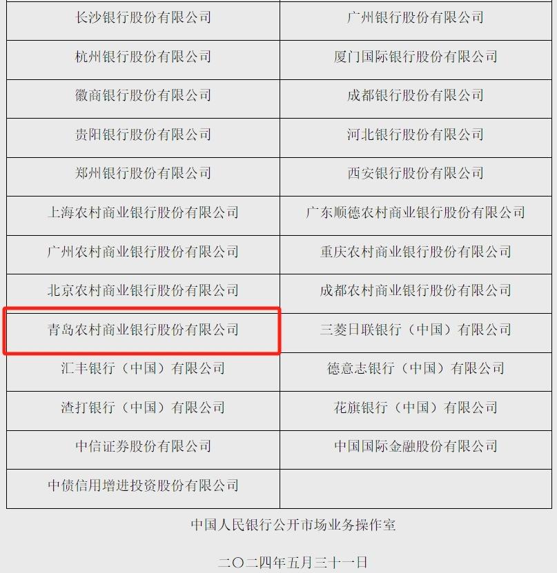 近日,中国人民银行公布了2024年度公开市场业务一级交易商名单。其中,今年青岛农商银行成功跻身公开市场业务一级交易商行列。