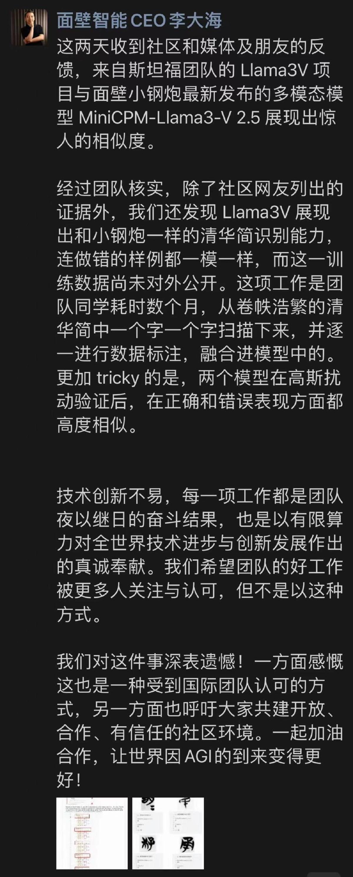 6月3日,面壁智能CEO李大海与联合创始人刘知远先后发文,回应开源模型被斯坦福大学AI团队抄袭一事。李大海表示:“我们对这件事深表遗憾。一方面感慨这也是一种受到国际团队认可的方式,另一方面呼吁大家共建开放、合作、有信任的社区环境。”“我们希望团队的好工作被更多人关注与认可,但不是以这种方式。”