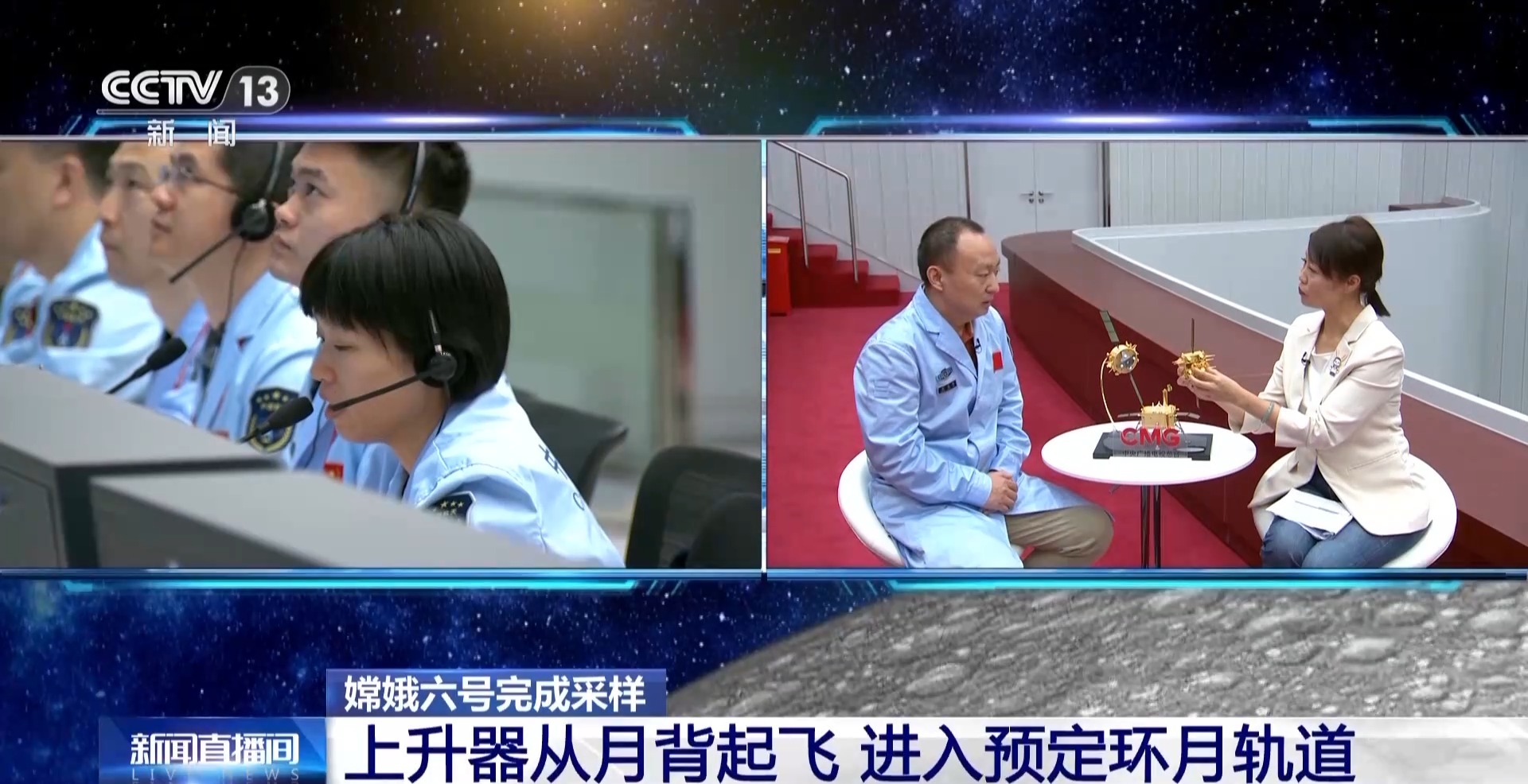 总台央视记者 崔霞 :7时38分点火起飞后,嫦娥六号上升器经历垂直上升、姿态调整和轨道射入三个阶段,目前已经进入了预定的环月飞行轨道。此时此刻嫦娥六号状态怎么样?