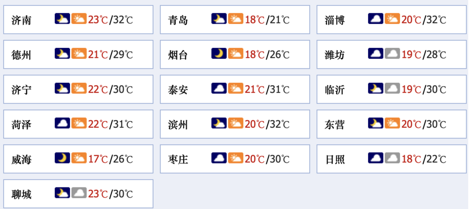 最低气温:菏泽、济宁、泰安、济南、淄博和鲁西北地区22℃左右,烟台和威海16℃左右,其他地区18℃左右。 最高气温:菏泽、济宁、鲁西北和鲁中地区30℃左右,南部沿海地区24℃左右,其他地区27℃左右。