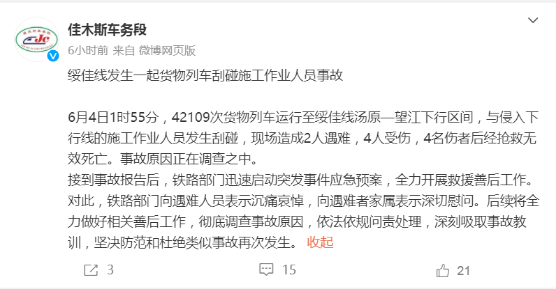 @佳木斯车务段 微博消息,绥佳线发生一起货物列车刮碰施工作业人员事故。6月4日1时55分,42109次货物列车运行至绥佳线汤原—望江下行区间,与侵入下行线的施工作业人员发生刮碰,现场造成2人遇难,4人受伤,4名伤者后经抢救无效死亡。事故原因正在调查之中。