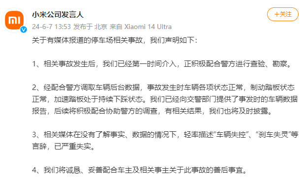 6月7日,小米公司发布声明称,相关事故发生后,已经第一时间介入,正积极配合警方进行查验、勘察。公司将诚恳、妥善配合车主及相关事主关于此事故的善后事宜。