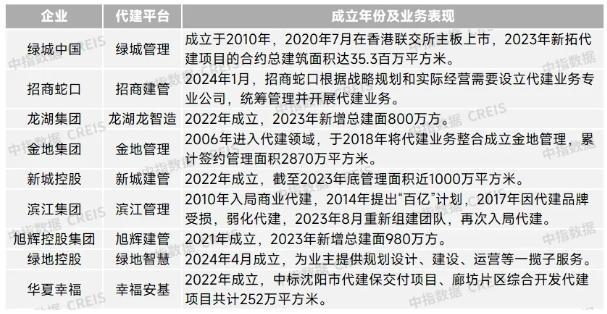在探索轻资产业务中,代建是重要方向。据中指研究院统计,目前已有超90家企业涉足代建领域,其中优秀代表房企代建业务增长较快、占据较高市场份额。在房地产行业持续低迷的环境下,房地产代建业务呈现了逆势上扬的趋势,2023年代建行业整体新拓建筑面积超1.5亿平方米。代表房企布局代建业务较早,营业规模保持稳定增长,凭借自身管理与品牌优势在市场中占据先发位置。如绿城中国旗下上市代建平台绿城管理2018年至2023年收入年复合增长率达17.4%,2023年全年营收达33.02亿元。
