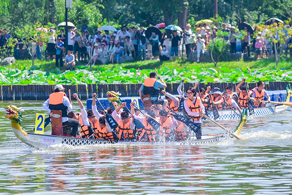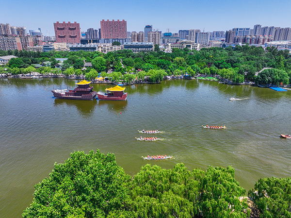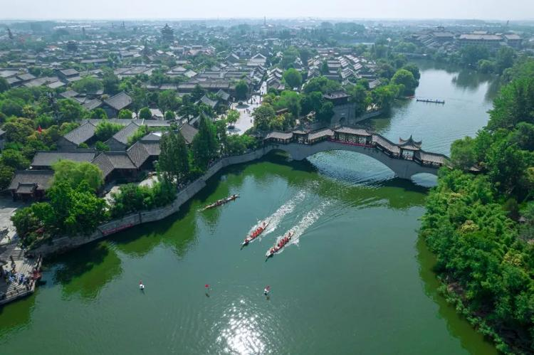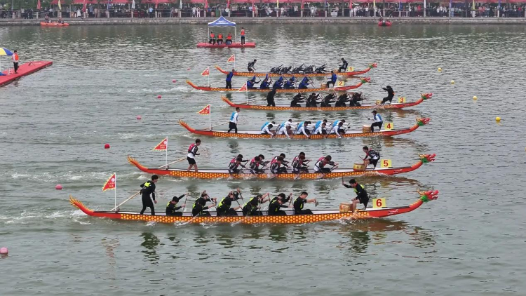 6月2日,台儿庄古运河上鼓声响,龙舟竞渡棹桨起。
