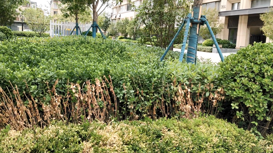 6月4日,帮办记者来到位于济南市历城区唐冶街道的保利·和唐悦色,与业主们一同查看了小区内的绿化情况。帮办记者看到,园区内确实植被比较单一,缺乏层次感,以草坪、冬青、树木为主,且难见较为粗壮茂盛的树木,未见到花卉,个别植被还出现了枯萎的情况。王昊认为,目前小区绿化程度低,单元门前的区域有些过宽,侵占了业主们的绿化面积。