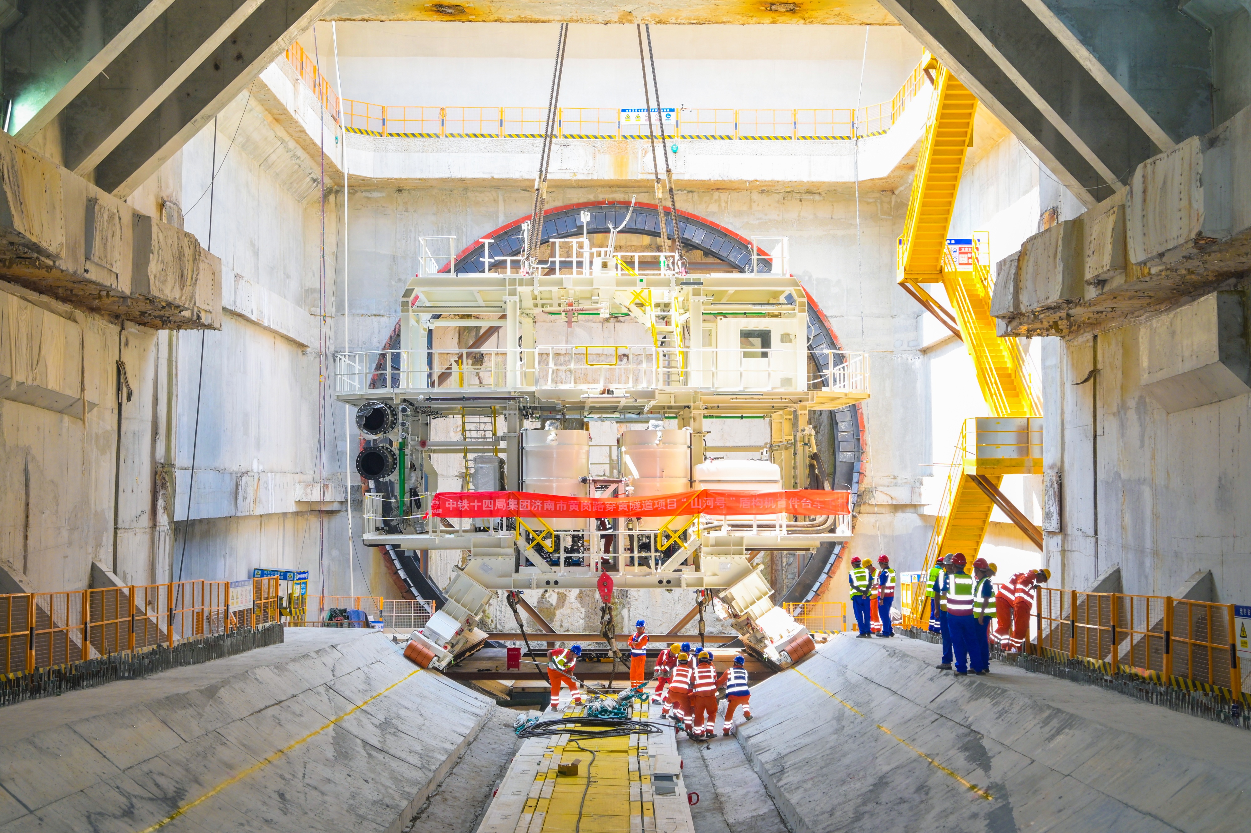 针对项目地质情况量身定制的“山河号”,是世界在建最大直径泥水平衡盾构机,最大开挖直径17.5米,盾构机总长163米、重达5200吨、装机总功率12580千瓦,主要由刀盘、12块盾体、主驱动、拼装机、桥架、四节后配套台车及附属部件组成,盾构机总装达到世界先进水平。