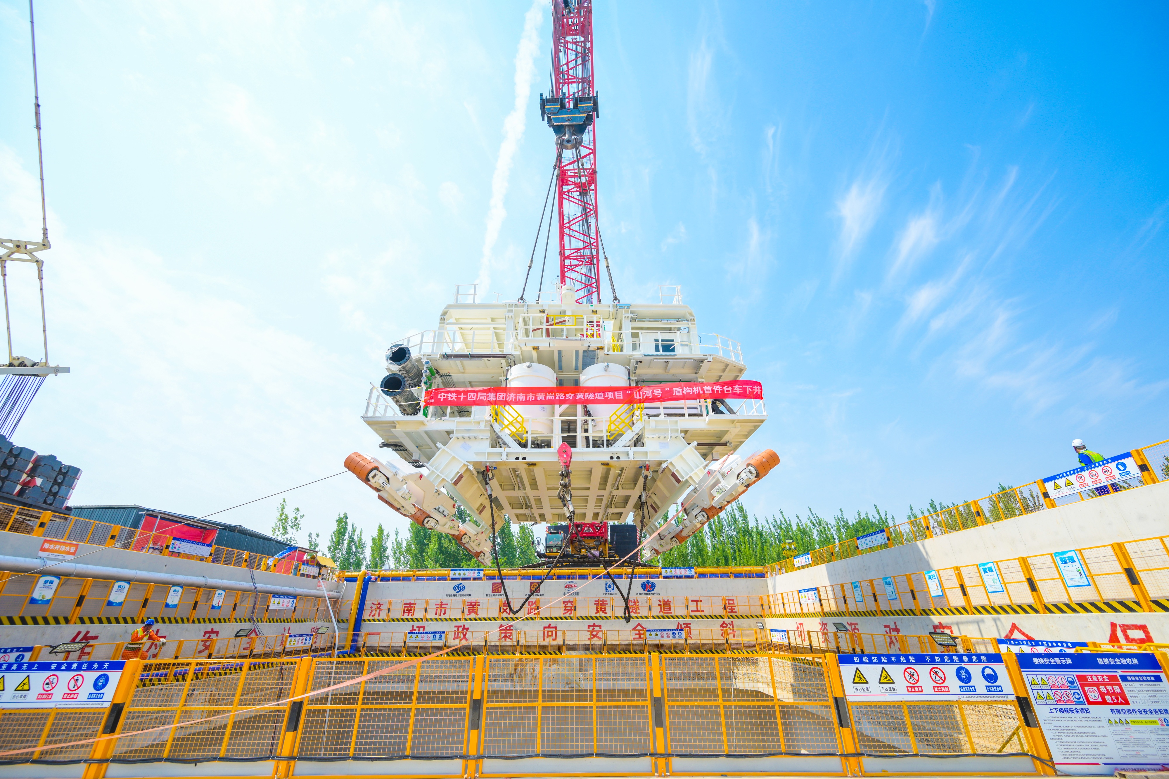 “现场所有岗位请注意,吊装作业前安全检查已完成,无安全隐患,开始吊装下井。”6月11日,随着中铁十四局集团济南市黄岗路穿黄隧道项目盾构经理薛永超的指令下达和一声清脆的哨声响起,一号台车缓缓从地面升起,标志“山河号”盾构机首件开始吊装下井,拉开了世界在建最大直径泥水平衡盾构下井组装的序幕,为盾构机始发掘进重大节点目标的实现奠定了基础。