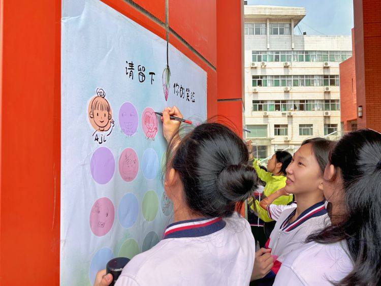 张店区实验中学的同学们在特制的笑脸展板上留下自己的灿烂笑容,通过绘画的方式描绘自己的心情,为大家带来欢乐和轻松的体验。