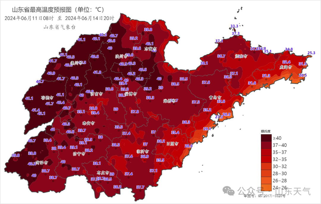 当前,高温过程仍在持续。山东省气象台于6月11日16时继续发布高温橙色预警:预计12—14日,我省内陆地区最高气温37—39℃,沿海地区30—35℃。其中12—13日,德州、聊城、滨州、东营、济南、淄博、潍坊、菏泽和济宁的部分地区最高气温可达40—42℃。