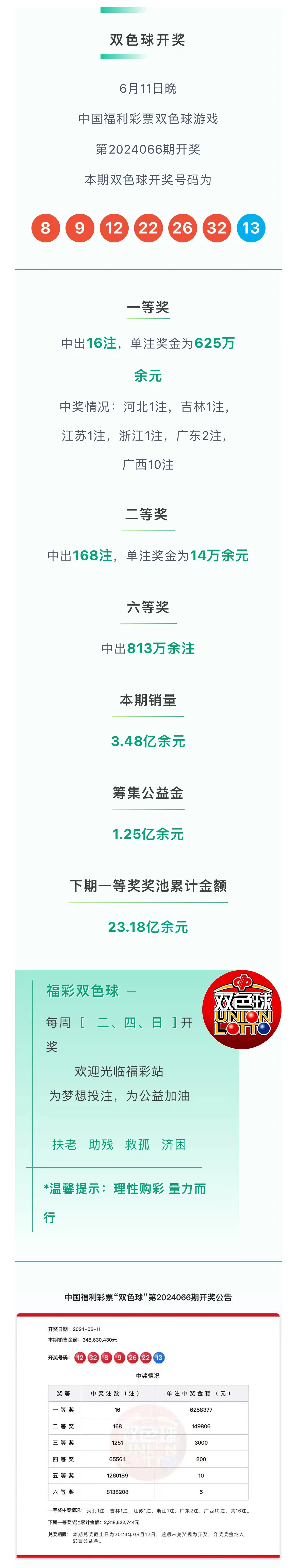 双色球2024066期中出一等奖16注筹集公益金1.25亿元