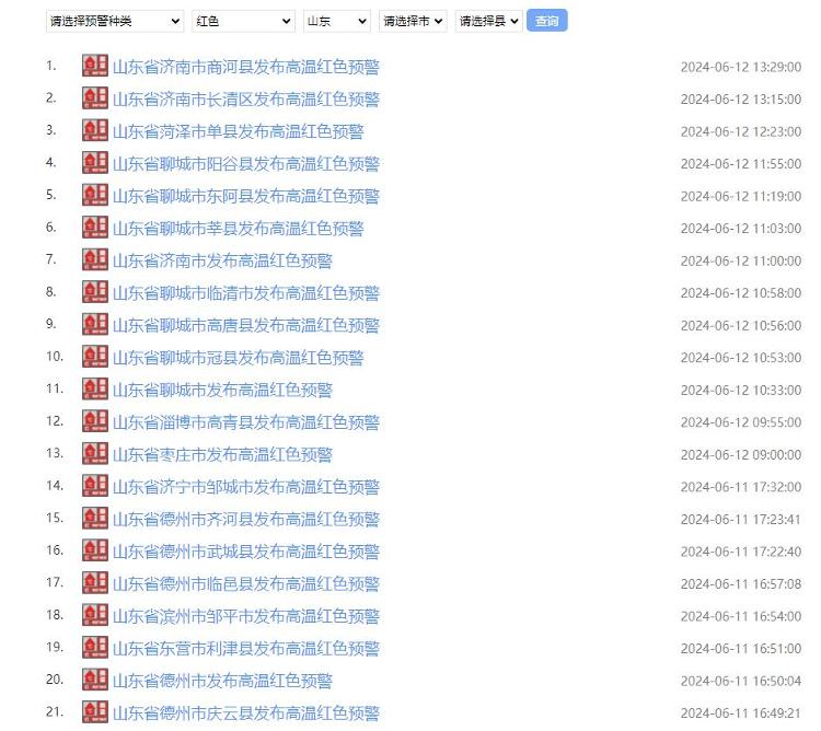 截至6月12日13时30分,山东共有71个高温预警正在发布,其中最高级别的红色预警达到36个,发布城市为济南、菏泽、聊城、淄博、枣庄、济宁、德州、滨州、东营、潍坊、泰安,烟台。