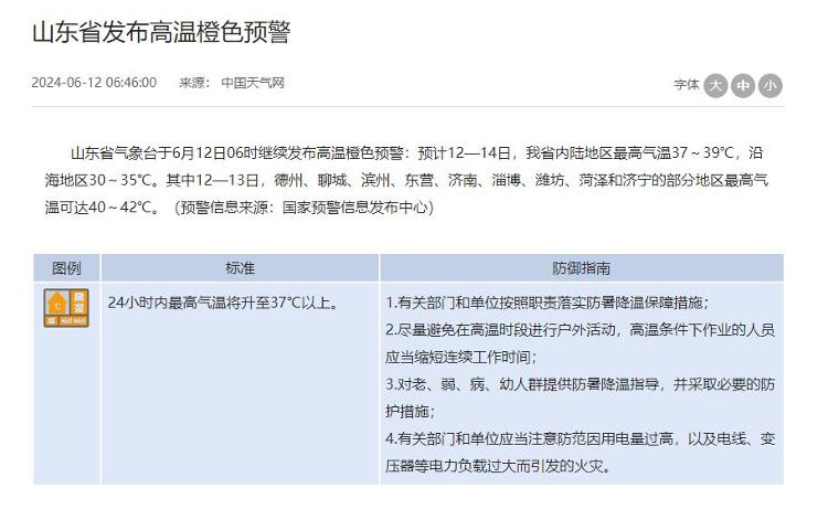 山东省气象台12日继续发布高温橙色预警:预计12—14日,我省内陆地区最高气温37℃~39℃,沿海地区30℃~35℃。其中12—13日,德州、聊城、滨州、东营、济南、淄博、潍坊、菏泽和济宁的部分地区最高气温可达40℃~42℃。
