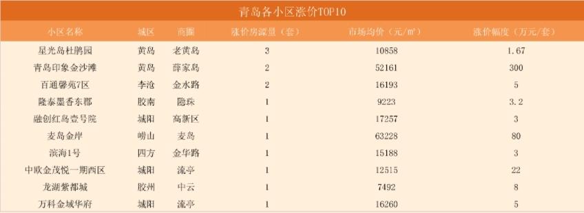 涨价榜单中,星光岛杜鹃园、青岛印象金沙滩、百通馨苑七区的涨价房源量位居前三名。从涨价幅度来看,第23周青岛各小区涨价幅度集中在1.67万元/套~300万元/套。据了解,青岛印象金沙滩有套总价超千万元的房源涨价幅度最大,但这样的涨价房源仅是个例,更多的房源还是以降价为主。