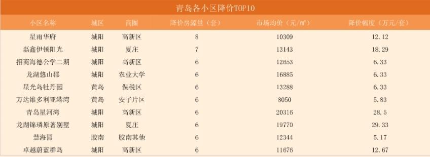 青岛各小区涨降价TOP10名单公布,星雨华府降价房源量居首
