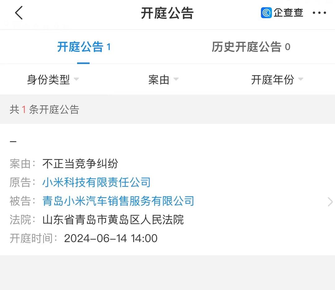 近日,小米科技有限责任公司(以下简称为“小米”)与青岛小米汽车销售服务有限公司相关不正当竞争纠纷案件新增开庭公告,原告为小米科技有限责任公司,该案件将于6月14日在青岛市黄岛区人民法院开庭审理。