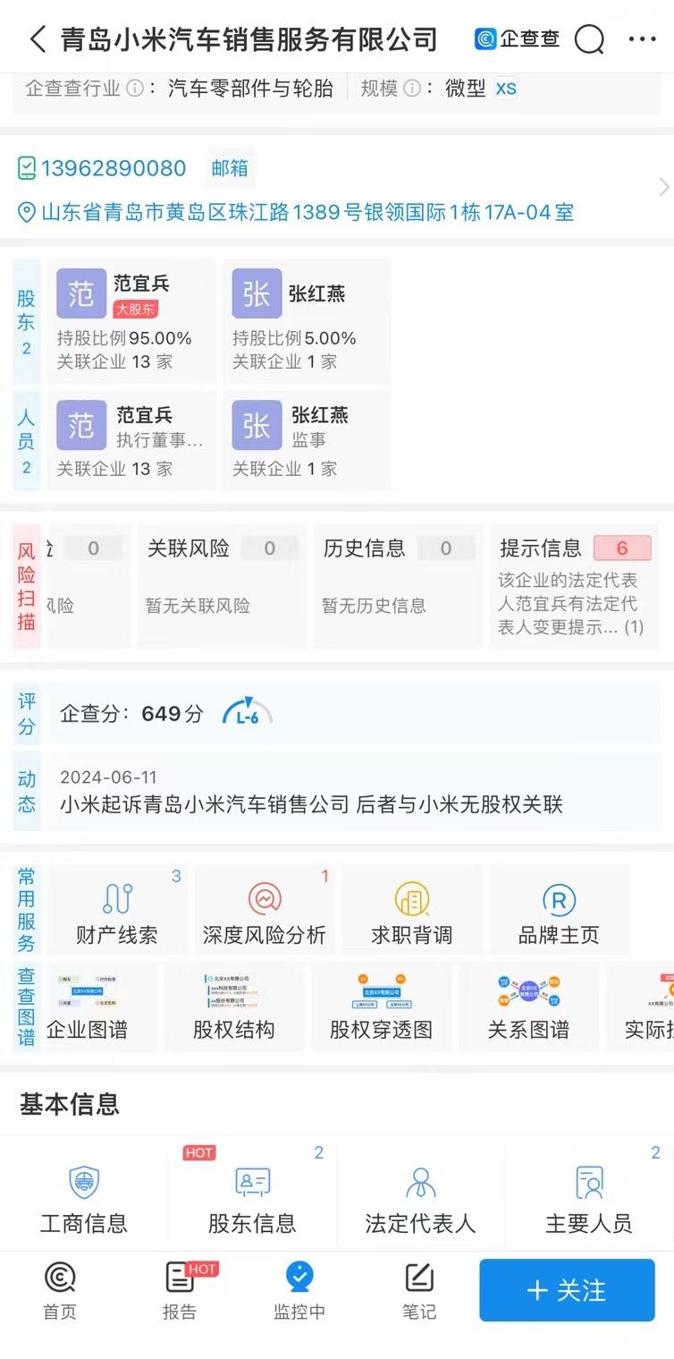 企查查显示,青岛小米汽车销售服务有限公司成立于2016年7月,注册资本100万人民币,由两位自然人共同持股,其与小米相关公司并无任何股权关联。虽然小米汽车有限公司是2021年9月1日成立的,但小米公司的商标注册于2010年。小米起诉青岛小米汽车销售服务公司的官司再次引起了人们对品牌名称和商标保护的关注。这场官司背后的矛盾,实际上是对品牌知名度和商标权益的保护。