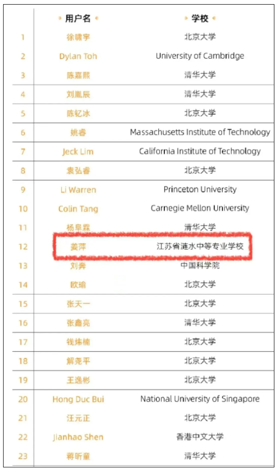 6月13日,在2024“阿里数赛”公布的决赛名单中,来自全球各地的801名数学高手成功晋级。其中,位列12名,被北京大学、清华大学、剑桥大学、麻省理工学院、普林斯顿大学等一众名校包围的姜萍显得有些特别。
