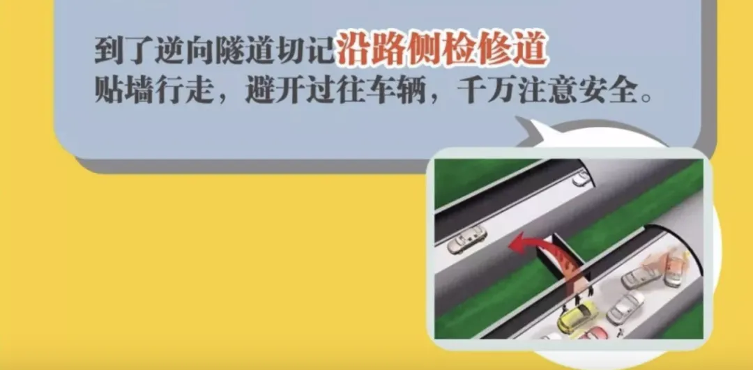 穿过隧道后,切记要沿路侧检修道贴墙行走,避开过往车辆。