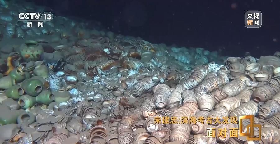 南海西北陆坡沉船遗址考古调查项目负责人 宋建忠:在潜器下潜的过程当中,我们是不开灯光的,完全是漆黑一片。当我们到达沉船现场的时候,灯光一打开,你会看到很震撼的场面。从条形区的散落带我们开始向核心区推进的时候,看到沉船上甩下来的货物,比如有陶器瓷器,大概有300多米长,有50多米宽。