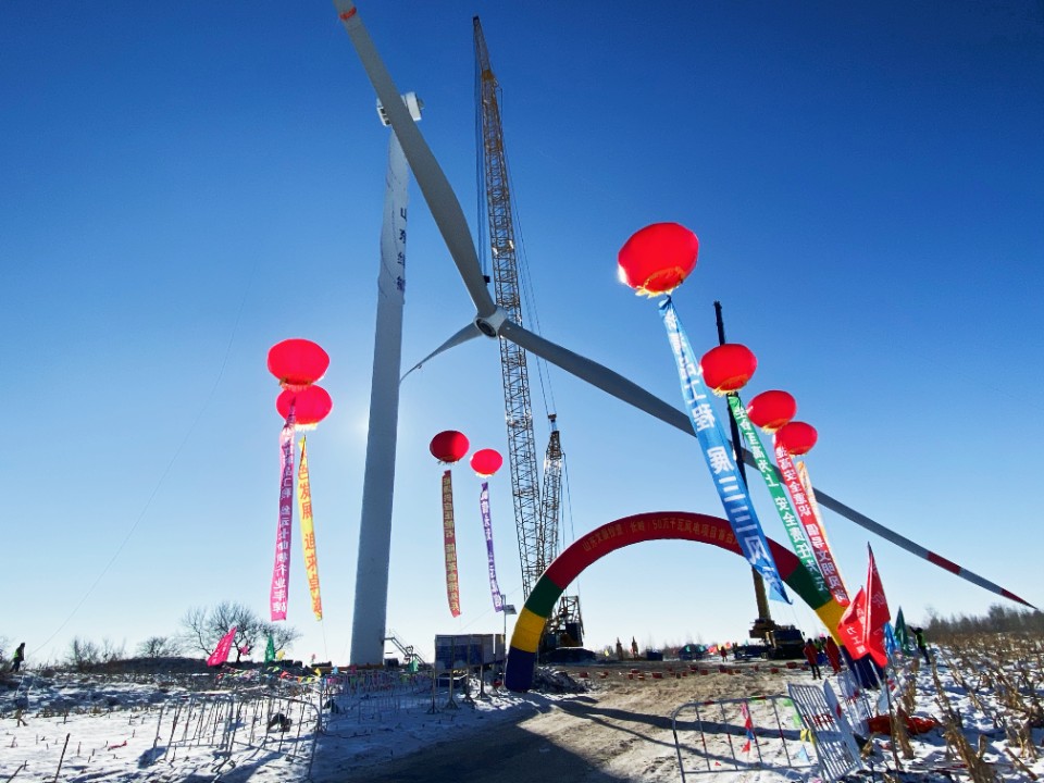2021年12月17日,“吉电入鲁”新能源项目完成首台风机吊装