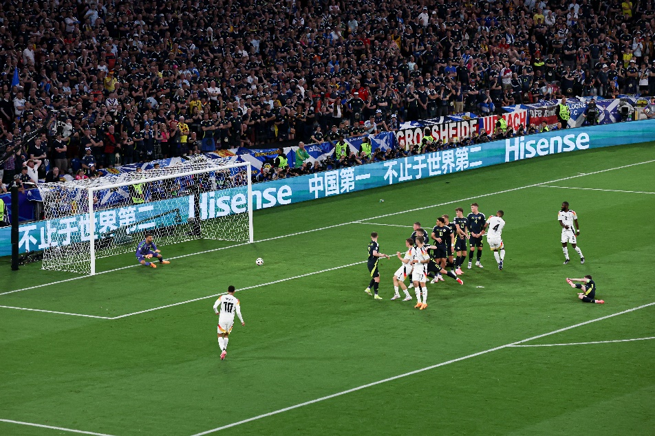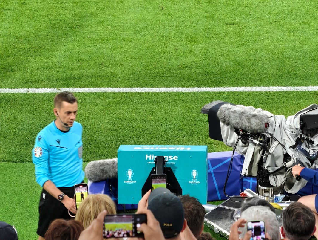 在官方赞助商身份之外,海信今年还作为2024欧洲杯VAR(视频助理裁判)提供显示技术支持,助力裁判做出更精准的判断。在德国与苏格兰的首场比赛中,海信VAR助理裁判技术给出本届欧洲杯第一张红牌第一颗点球。这是欧足联历史上首次开放VAR显示独家权益,背后是海信50余年的显示技术积淀。从品牌广告到技术合作,海信已经进入了全球化新阶段,中国显示技术在最严苛的场景中得到检验和认可。