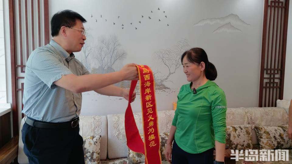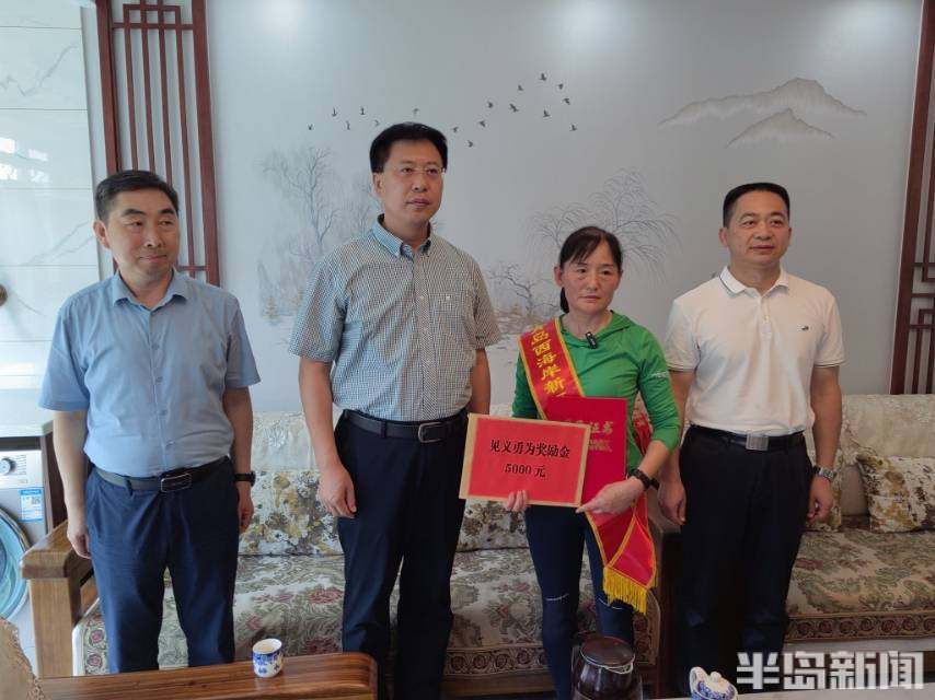 6月13日,青岛西海岸新区城市阳台附近海域,一名游客距离岸边200多米溺水。青岛大姨卞秀芹毫不犹豫冲入怒海,一个人乘风破浪将溺水大叔救回。英勇救人的事迹,被全国亿万网友点赞。6月18日,青岛西海岸新区政法委的工作人员来到卞秀芹的家中,为其颁发“青岛西海岸新区见义勇为模范”证书,并给予现金奖励5000元。