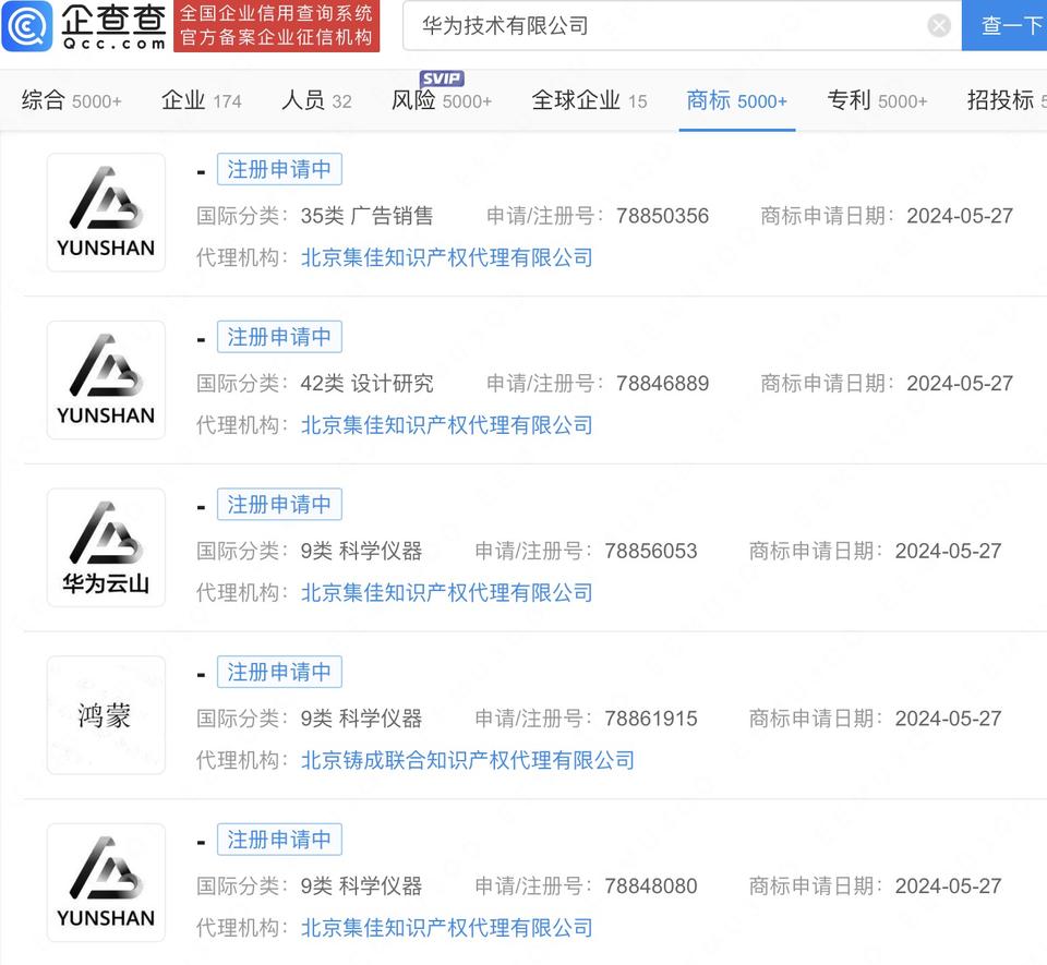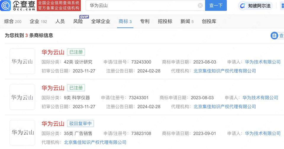 企查查APP显示,近日,华为技术有限公司申请注册“华为云山”“YUNSHAN”图形商标,国际分类包括科学仪器、设计研究、广告销售,当前商标状态为注册申请中。去年8月,华为申请注册3枚“华为云山”文字商标,其中科学仪器、设计研究类商标已于今年2月注册成功。