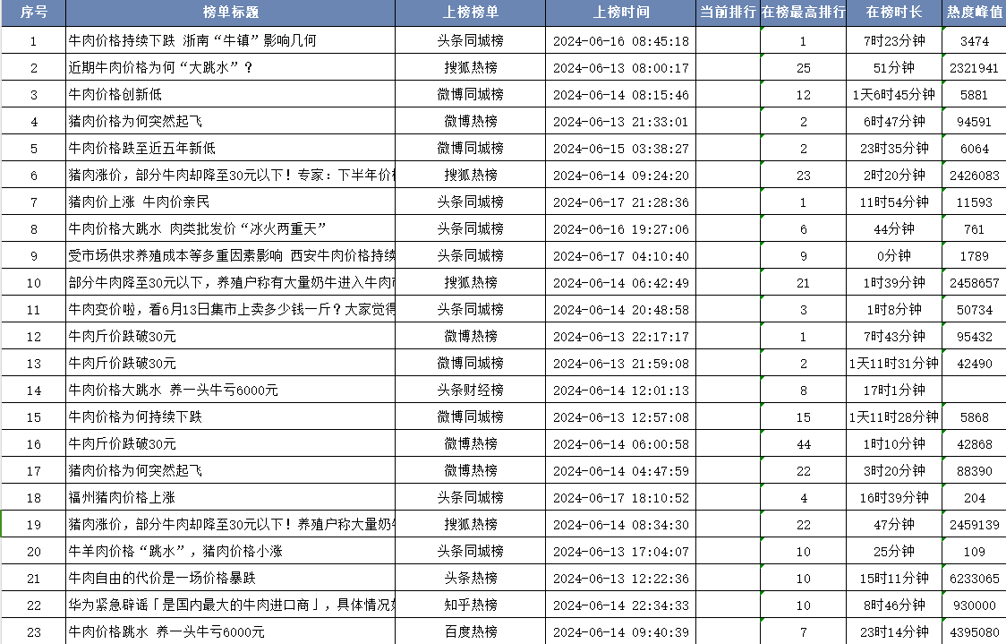 据齐鲁蛙眼舆情大数据平台监测显示。自6月13日至18日13时,涉及猪肉、牛肉价格的相关话题信息量约9万条,形成23个热搜话题。
