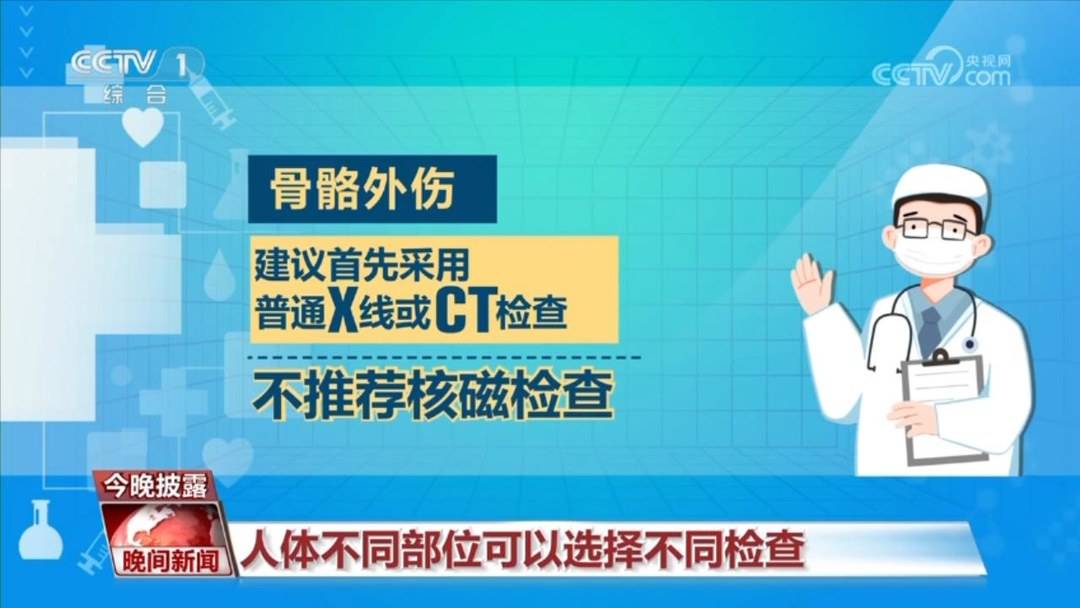 专家介绍,人体不同的部位或疾病,需要不同的检查。例如,骨骼外伤,建议首先采用普通X线或CT检查,不推荐核磁检查;而脊椎疾病则建议首选核磁检查,其次是CT检查。具体情况还需听从医嘱。