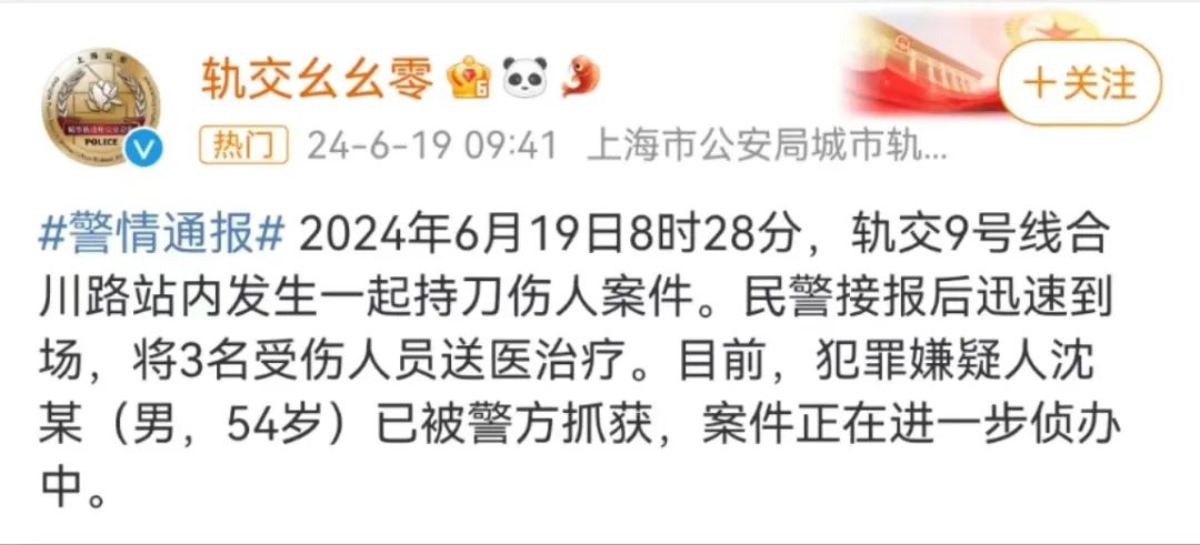 记者从上海警方获悉,2024年6月19日8时28分,轨交9号线合川路站内发生一起持刀伤人案件。民警接报后迅速到场,将3名受伤人员送医治疗。目前,犯罪嫌疑人沈某(男,54岁)已被警方抓获,案件正在进一步侦办中。