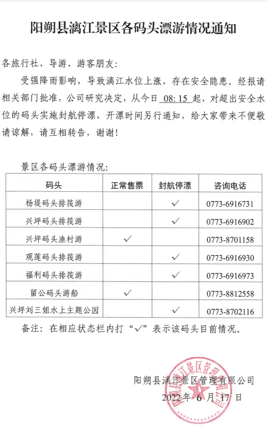 阳朔著名的景区阳朔县漓江景区在6月17日发布了封航停漂通知,称受强降雨影响导致漓江水位上涨,存在安全隐患,对超出安全水位的码头实施封航停漂。