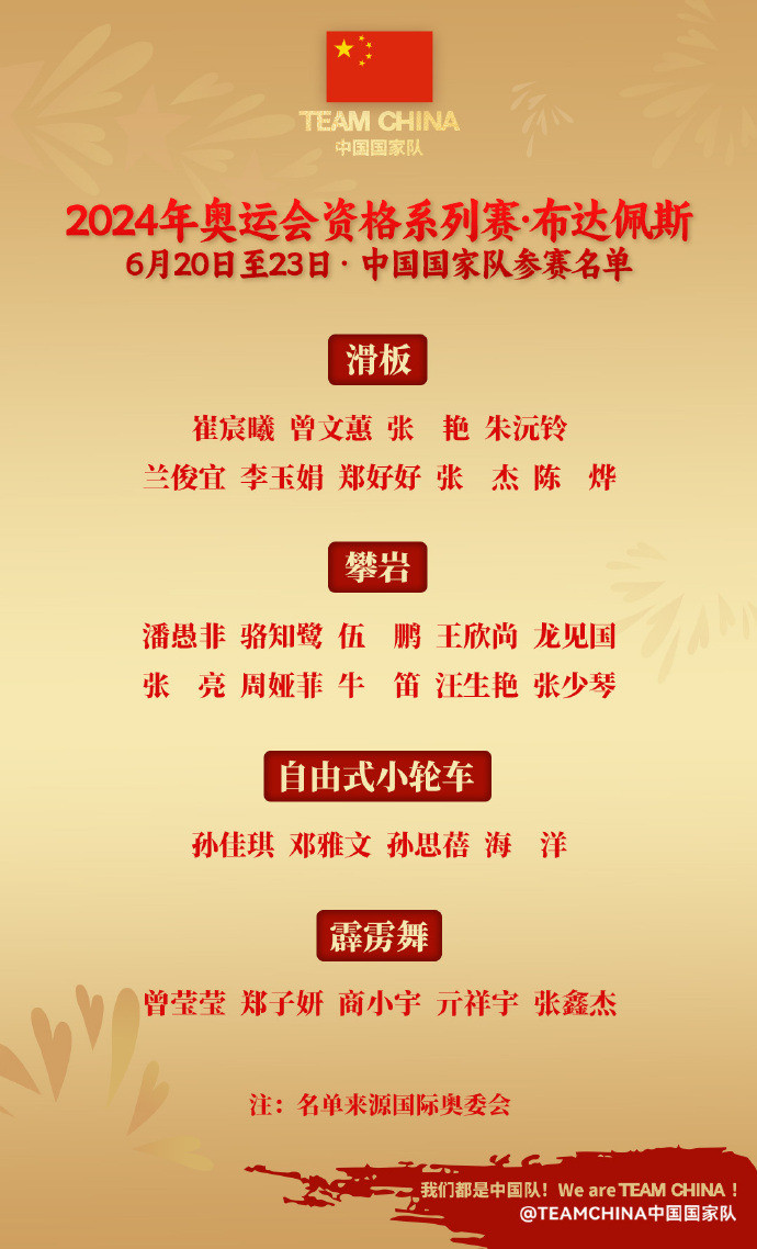 奥运会资格系列赛布达佩斯站中国国家队参赛名单 图源:TEAMCHINA中国国家队官方微博