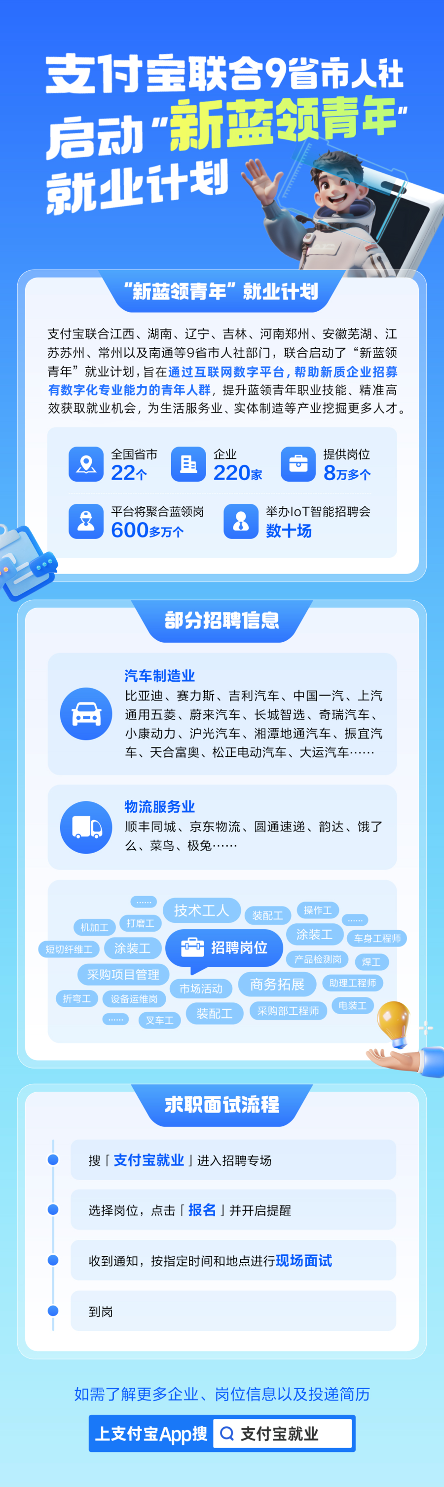 随着毕业季到来,今天,在江西、湖南、辽宁和吉林等9省市人社部门指导下,支付宝就业发动蔚来汽车、比亚迪、吉利、中国一汽、五菱、奇瑞、赛力斯、京东方,以及比克电池、信义光伏玻璃等22个省市220家新质生产力企业,联合发起了“新蓝领青年”就业计划。
