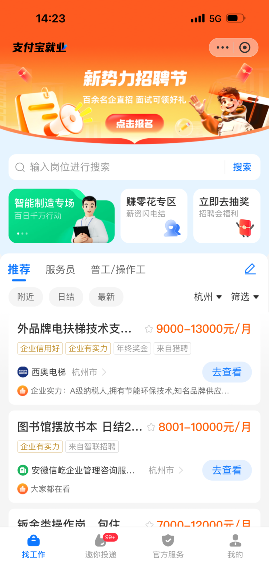 18号至25日,上支付宝搜“支付宝就业”进入“新势力招聘节”活动页,即可参与求职报名。