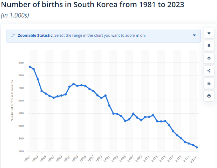1981年~2023年韩国出生人数走势 图片来源:MacroTrends