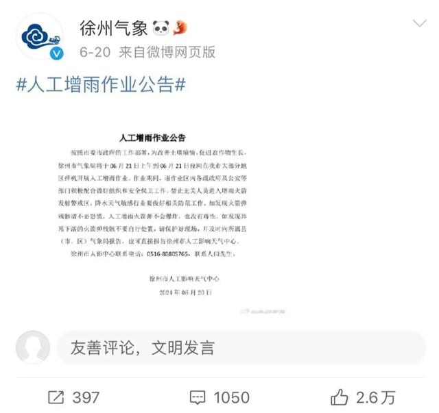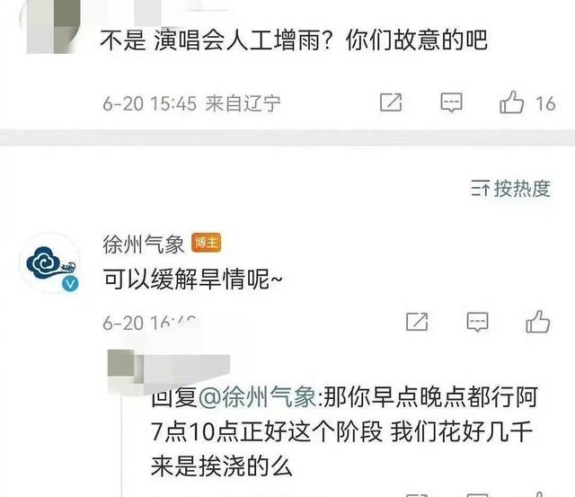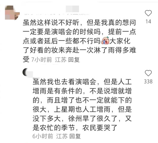 也有很多网友留言表示,徐州旱了很久,降雨也要考虑云量等各方面因素。“知道徐州等这场雨等了多久吗?”“我也去看了演唱会,人工增雨是有条件的,不是说增就增的,上星期也人工增雨,但是没下多大,徐州期待这场雨很久了,又是农忙季节,农民要哭了。”“快快下,老百姓都盼着这个雨半年了。”