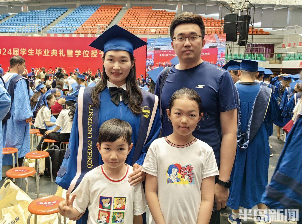 仪式现场,青大商学院硕士毕业生刘一旋与老公和两个孩子亲切合影,非常温馨。“我是有了宝宝之后,读了青大商学院MBA,今天毕业了,这三年来一路完成学业的过程,非常艰辛也很有成就感,感谢导师、家人、孩子给了很大的支持,让我完成了学历提升的梦想。”刘一旋激动地向记者分享,“在考研的过程中,我的父母、公婆都给了我很大的支持,他们帮我照顾孩子,帮我解决了后顾之忧,让我有机会完成自己的梦想,在这里要感谢我的父母和公公婆婆,他们都很伟大!”
