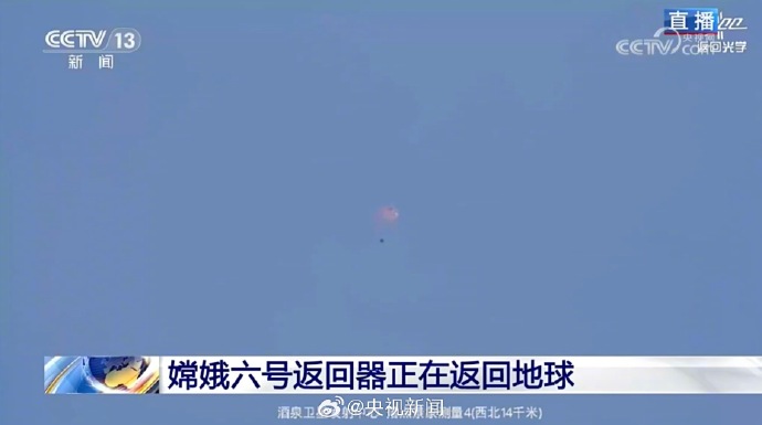 嫦娥六号返回器目前在距地面高度约120公里处,以接近第二宇宙速度在大西洋上空第一次进入地球大气层,实施初次气动减速。 嫦娥六号降落伞打开(央视新闻)