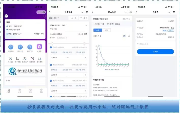 着力推进智能抄表、智能收费、智能工单等业务流程的集成创新,实现了从“报装-立户-抄表-计量-收费-缴费”的用水服务全流程智慧管理升级。随着集团“智能水表”应用的深入推进,目前约3万余的用户只需一部智能手机,就可轻松享受业务办理“零跑腿、零资料、零流程”的“三零服务”,随时“手机一点”,便可查询自家用水量、自助缴费等,系统还会在出现异常用水情况时及时发送提醒,有效保障用户权益、提升服务品质。