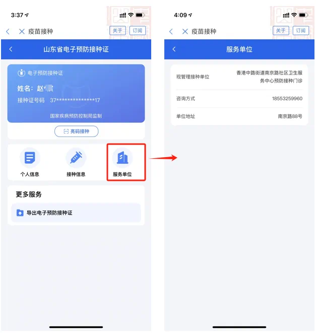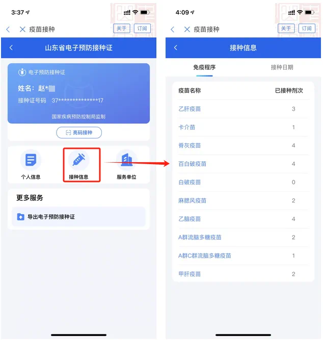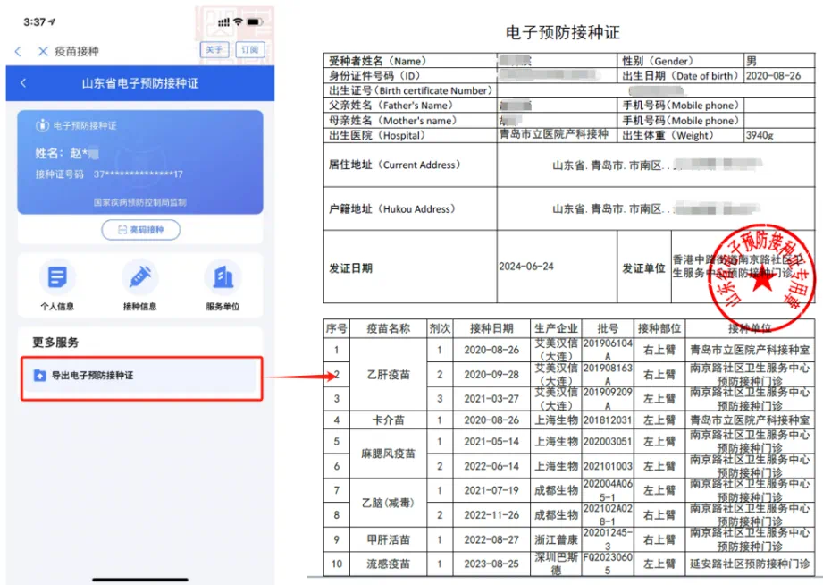 进入“疫苗接种”服务,点击“电子接种证”,进入“山东省电子接种证”导航页,即可获取电子接种证,并可实现“亮码接种”、个人信息和接种信息查询、服务单位信息查询、在线预约等功能,并可导出电子接种证PDF版文件,儿童受种者还可导出入托、入学预防接种完成情况评估报告。