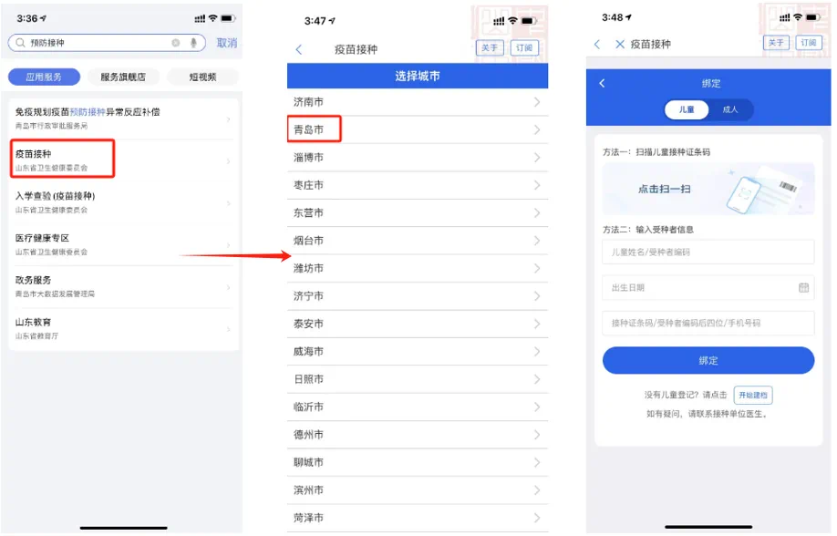 进入“爱山东”首页,搜索“疫苗接种”,点击“疫苗接种”,选择青岛市,通过预防接种档案编码或身份证号码进行受种者信息绑定;