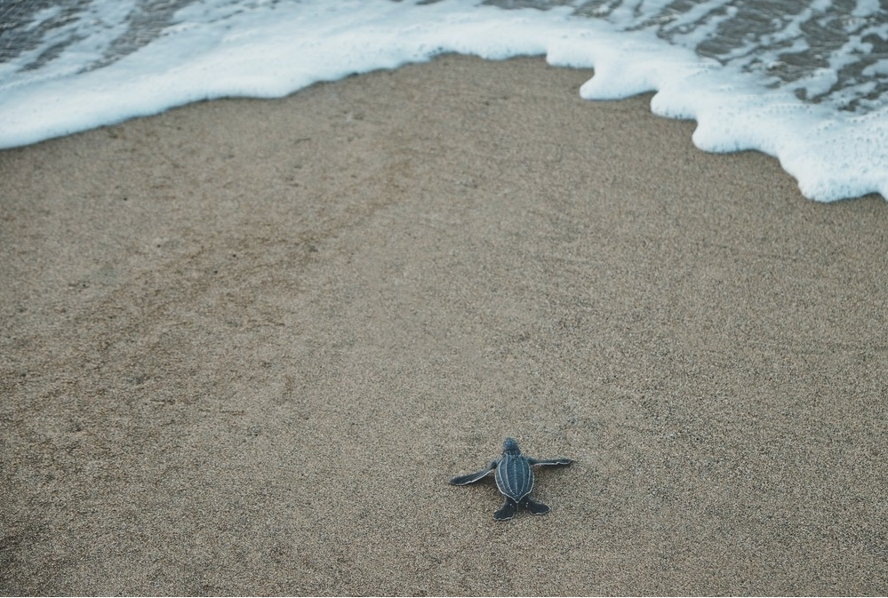 黄昏时,如果年幼的海龟们准备逃走,那么这时就先有一只小海龟冒出沙面来,做一番侦察,试探一下如果它的兄弟姐妹们跟着出来是否安全。