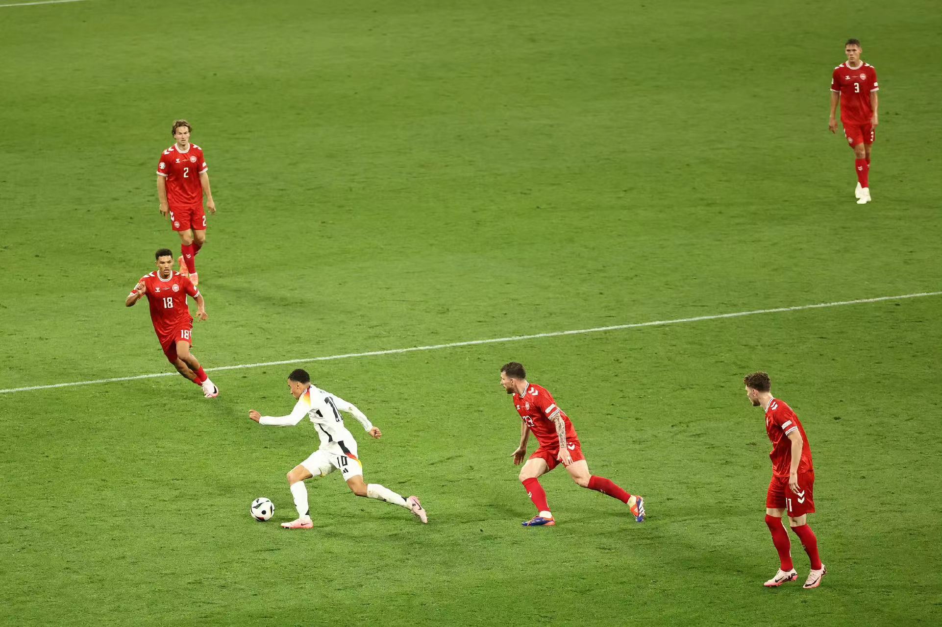 第53分钟,安德森在禁区内手球,VAR再次介入判罚德国队点球,哈弗茨一蹴而就帮助德国队1:0领先。进球后的德国就不再和丹麦玩缠斗了,手握优势就两翼大胆压上,左右路各自为哈弗茨喂了几个好饼,可惜“哈子”稳定发挥,一个都没把握住。直到68分钟,施洛特贝克一脚长传找到穆夏拉,穆夏拉单刀直入轻松破门,德国队2:0。此时防守穆夏拉的,还是安德森。