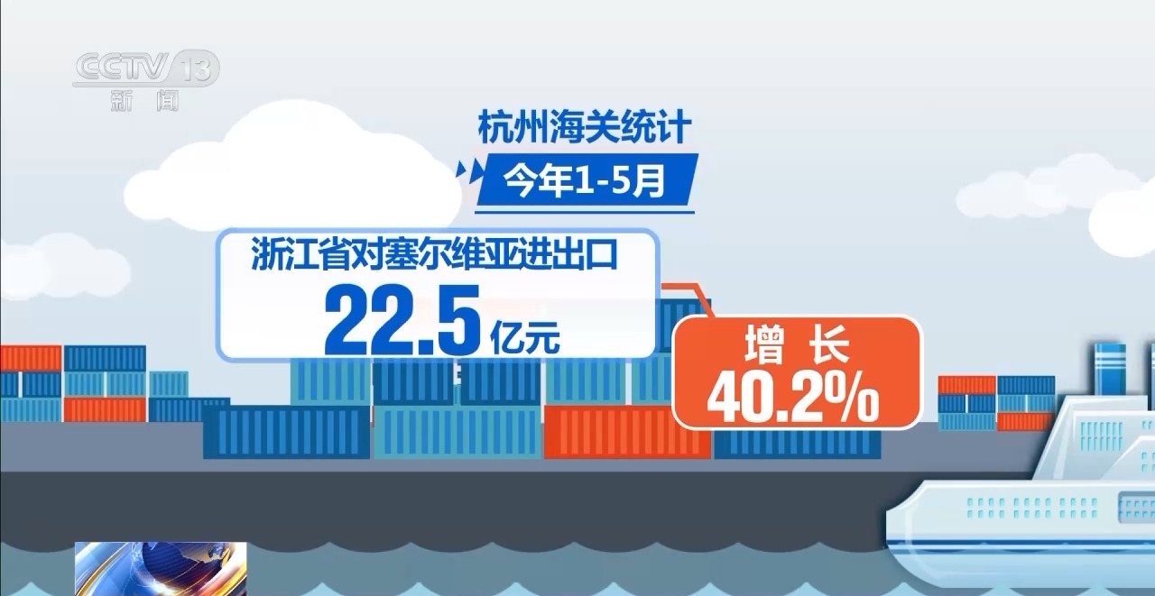据杭州海关统计,今年1到5月,浙江省对塞尔维亚进出口22.5亿元,增长40.2%。其中,出口16.5亿元,增长23.8%,进口6.0亿元,大幅增长121.1%。协定的生效将进一步利好浙江与塞尔维亚的进出口贸易。