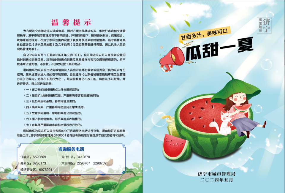 遵循“便民不扰民、放开不放任”的原则,济宁市主城区设立45处瓜果临时销售点,目前均已全部设置完毕,各点位已统一悬挂公示牌,临时垃圾桶,帐篷等,为瓜农开启网格化“绿色通道”。自2024年6月1日起到2024年9月30日,城区周边瓜农可以直接到设置的临时销售点销售瓜果。