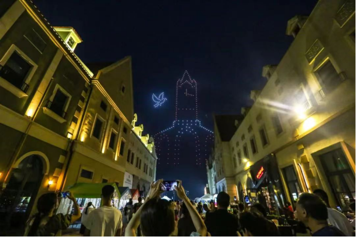 最令人震撼的莫过数百架无人机的空中表演。它们腾空而起,以天为幕,以海为景,在空中不断变换队形和色彩,从明亮的红黄蓝三原色,到渐变过渡的柔和色调,无人机编队在空中绘制出了一幅幅令人叹为观止的图案。这些图案或如盛开的花朵,或如翱翔的飞鸟,或如神秘的星座,无不令人叹为观止,为游客们带来了一场炫酷百变的视觉盛宴。