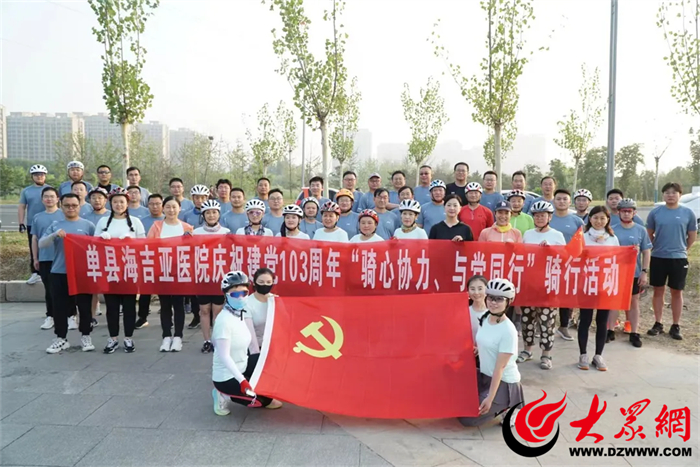 为庆祝中国共产党成立103周年,进一步增强团队凝聚力、战斗力,丰富医务人员的文化生活,倡导健康、向上、绿色的生活理念和低碳环保的生活方式,6月30日,单县海吉亚医院党总支组织开展“骑心协力 与党同行”骑行活动。单县海吉亚医院党员干部及各科室骑行爱好者共80余人参加。