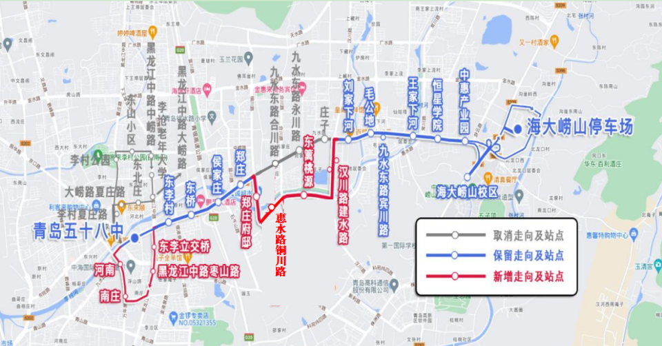 线路主站为海大崂山停车场,副站由李村公园变更为青岛五十八中,调整后为海大崂山停车场-青岛五十八中。