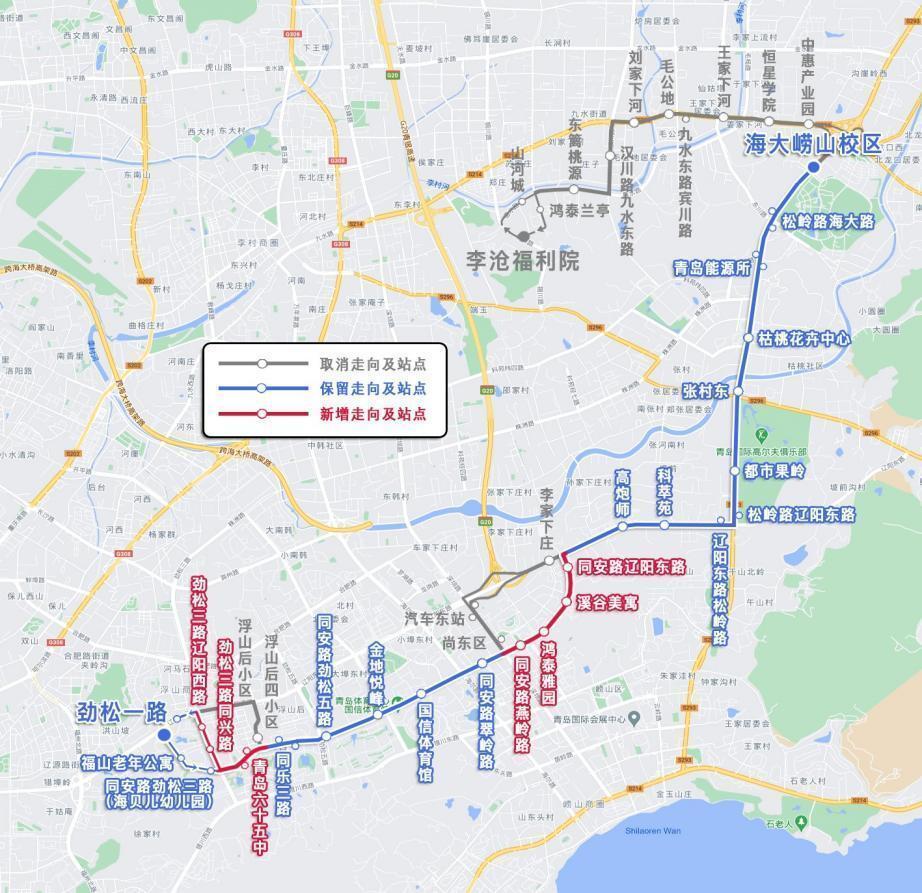 线路主站为劲松一路,副站由李沧福利院变更为海大崂山校区,调整后为劲松一路-海大崂山校区。