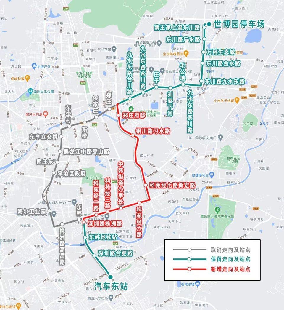 自“汽车东站”始发站发车,原线路至“东韩地铁站”站,往返沿深圳路、株洲路、科苑经七路、铜川路、九水东路至“九水东路合川路”站恢复原线行驶。